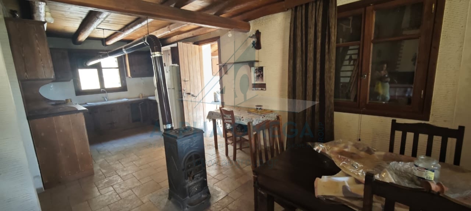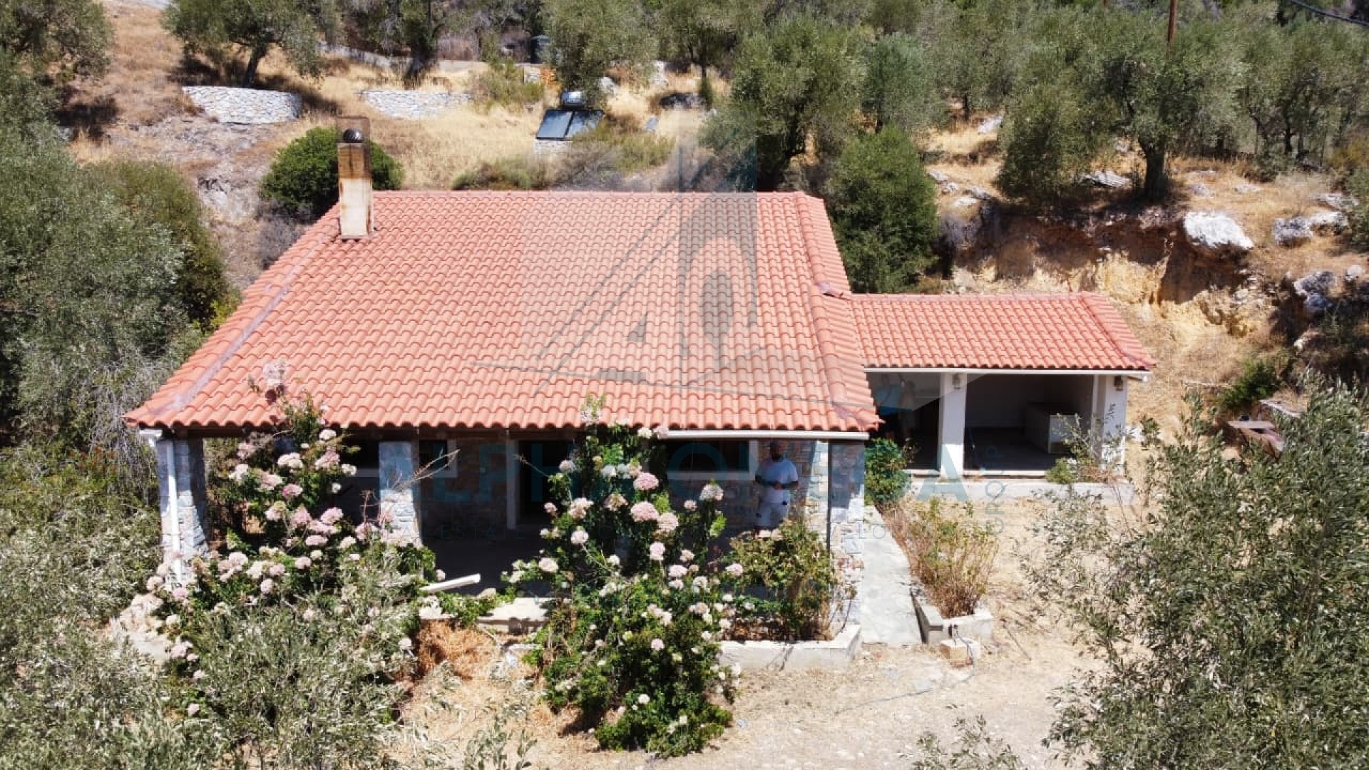 Το σπίτι, με την κεραμοσκεπή και την πέτρινη πρόσοψη, δένει αρμονικά με το φυσικό τοπίο. Έχει μια φιλόξενη αυλή, γεμάτη με βουκαμβίλιες, που προσφέρει ένα ευχάριστο σημείο για χαλάρωση.